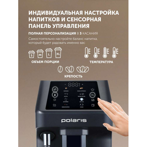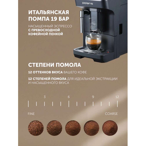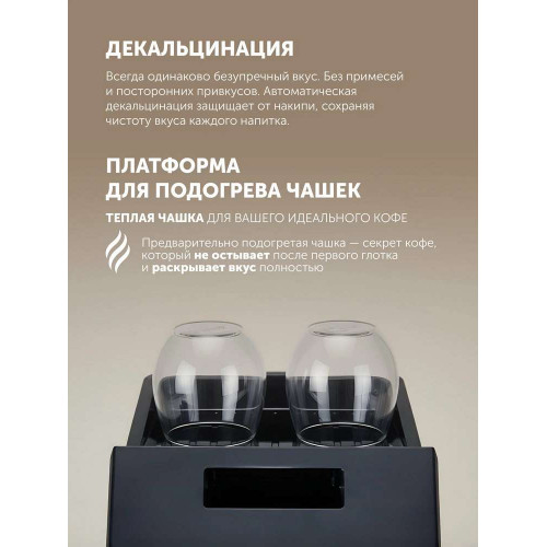 Настройки: Контроль крепости кофе, Настройка температуры напитка, Подогрев чашек, Предварительное смачивание кофе, Регулировка порции воды, Регулировка степени помола