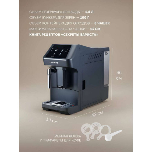 Особенности конструкции: дисплей, индикатор уровня воды, индикация отсутствия кофе, индикация работы, Индикация готовности к работе, Индикация необходимости очистки от накипи, Подача горячей воды, Режим самоочистки