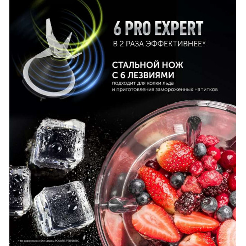 Технология 6 PRO EXPERT: 6 острых лезвий вращаются одновременно в 3 плоскостях, что в сочетании с мощным мотором позволяет измельчать и смешивать ингредиенты в 2 раза быстрее.