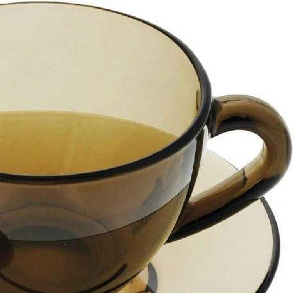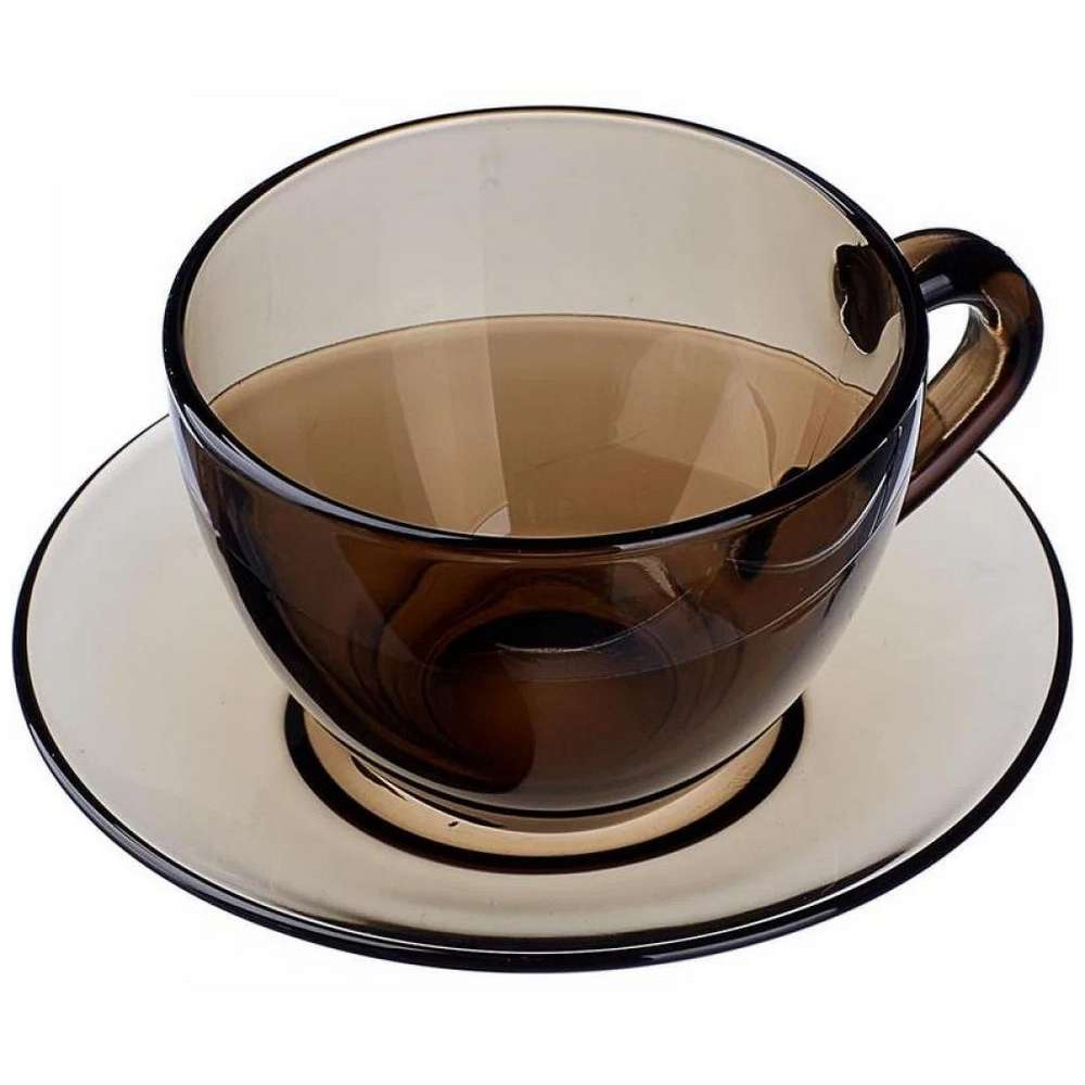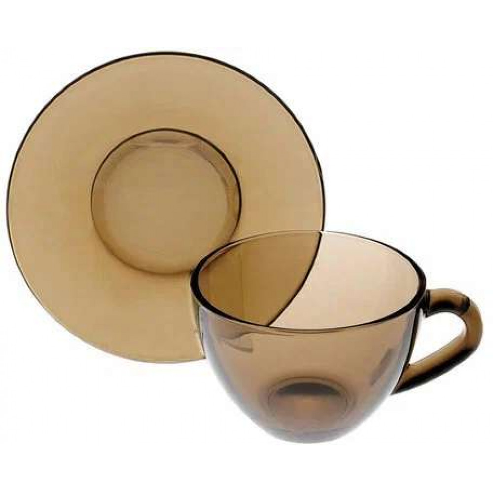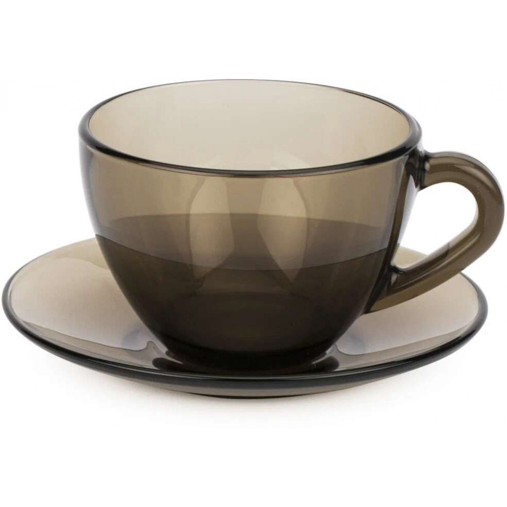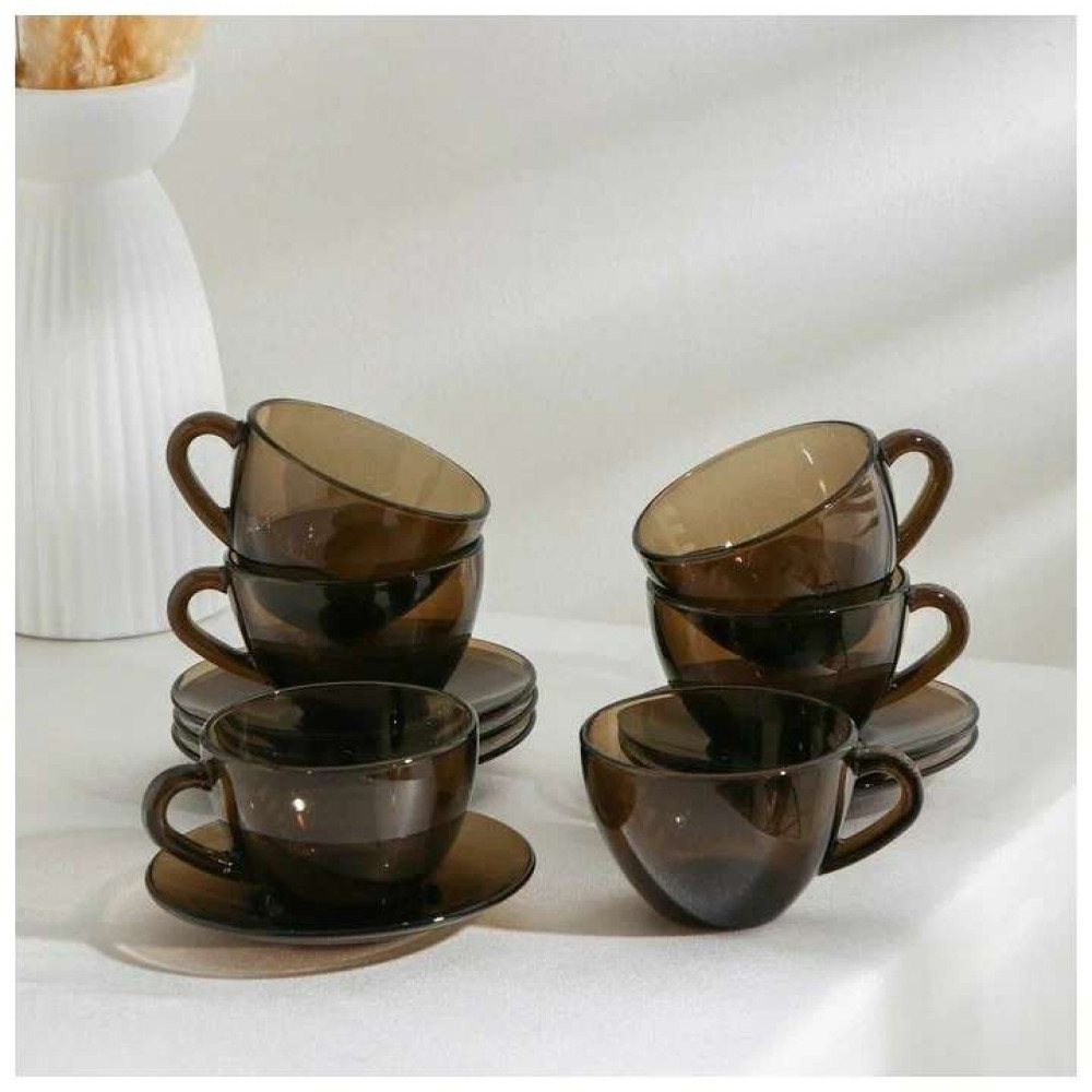 Чайный набор дымчатый. В наборе 6 чашек объемом 220 мл и 6 блюдец. Материал - ударопрочное стекло, устойчивое к резким перепадам температуры. Можно использовать в микроволновых печах/духовках и мыть в посудомоечных машинах.