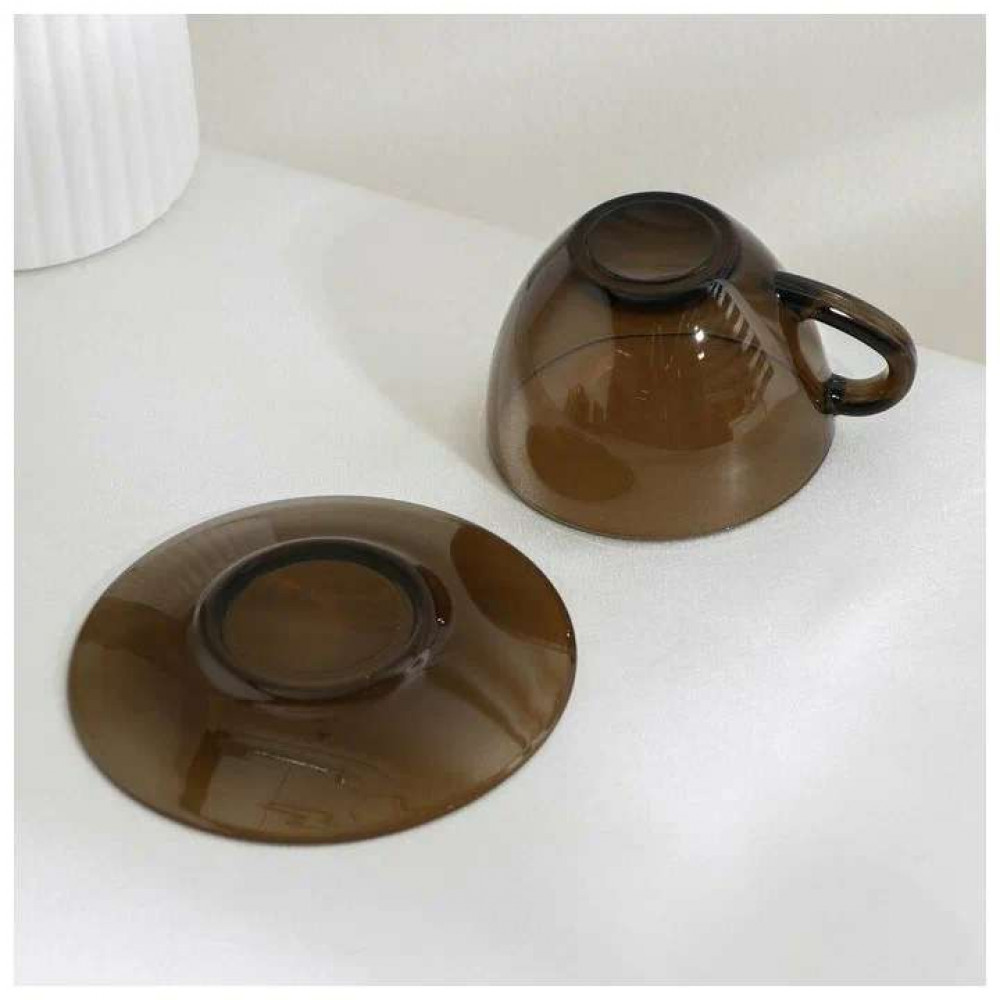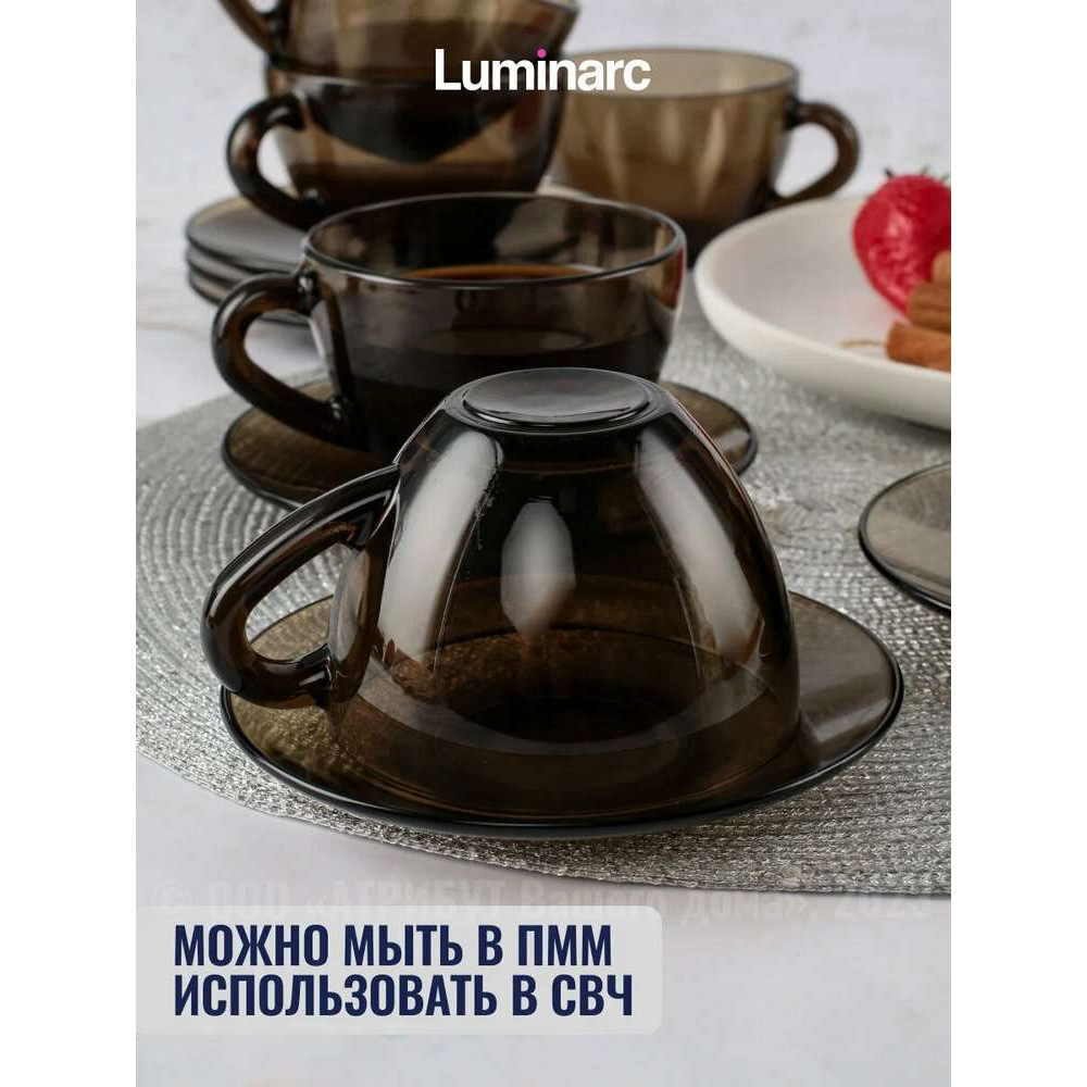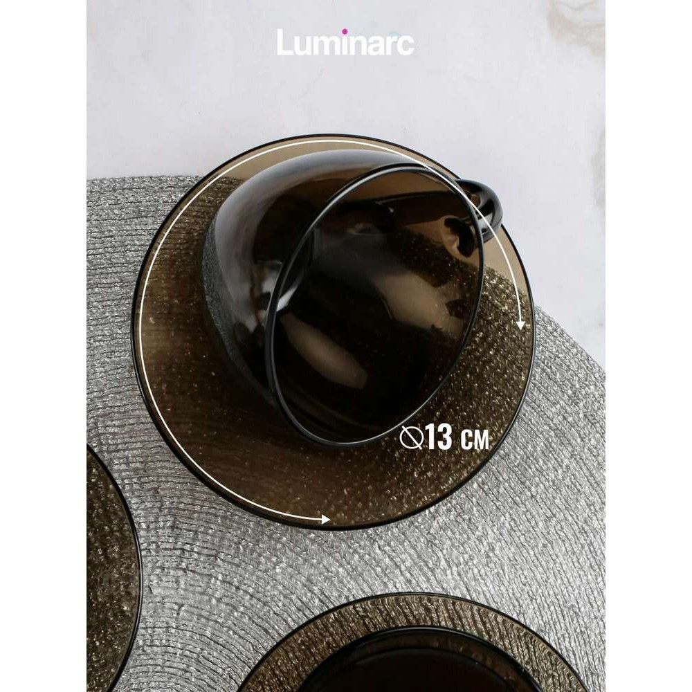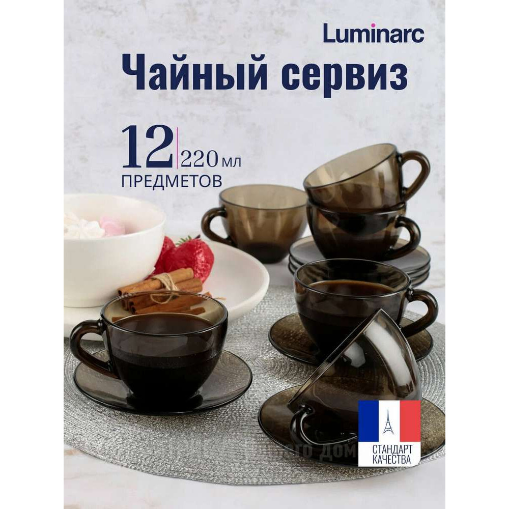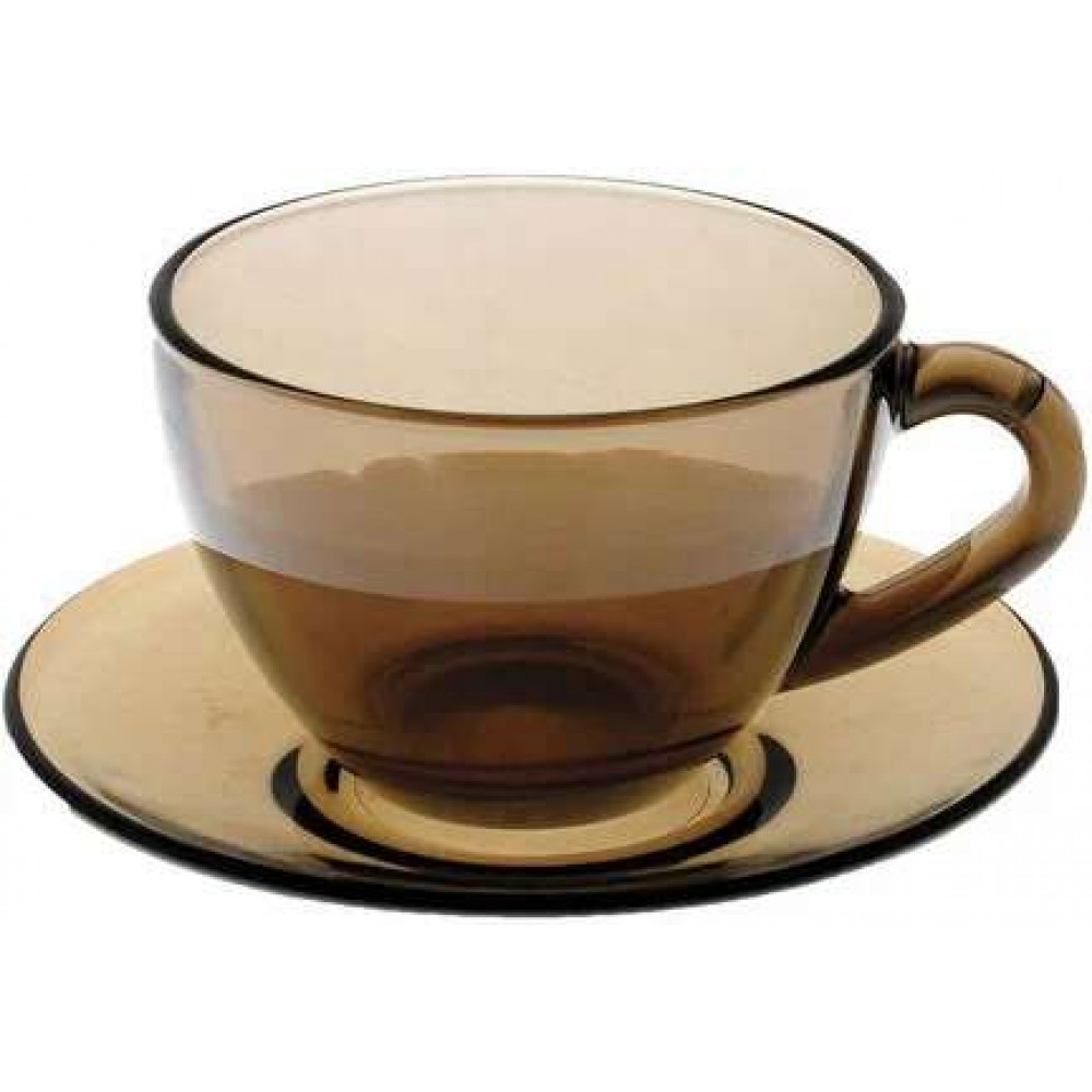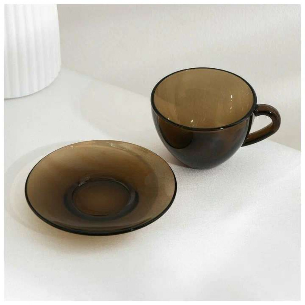Чайный набор дымчатый. В наборе 6 чашек объемом 220 мл и 6 блюдец. Материал - ударопрочное стекло, устойчивое к резким перепадам температуры. Можно использовать в микроволновых печах/духовках и мыть в посудомоечных машинах.