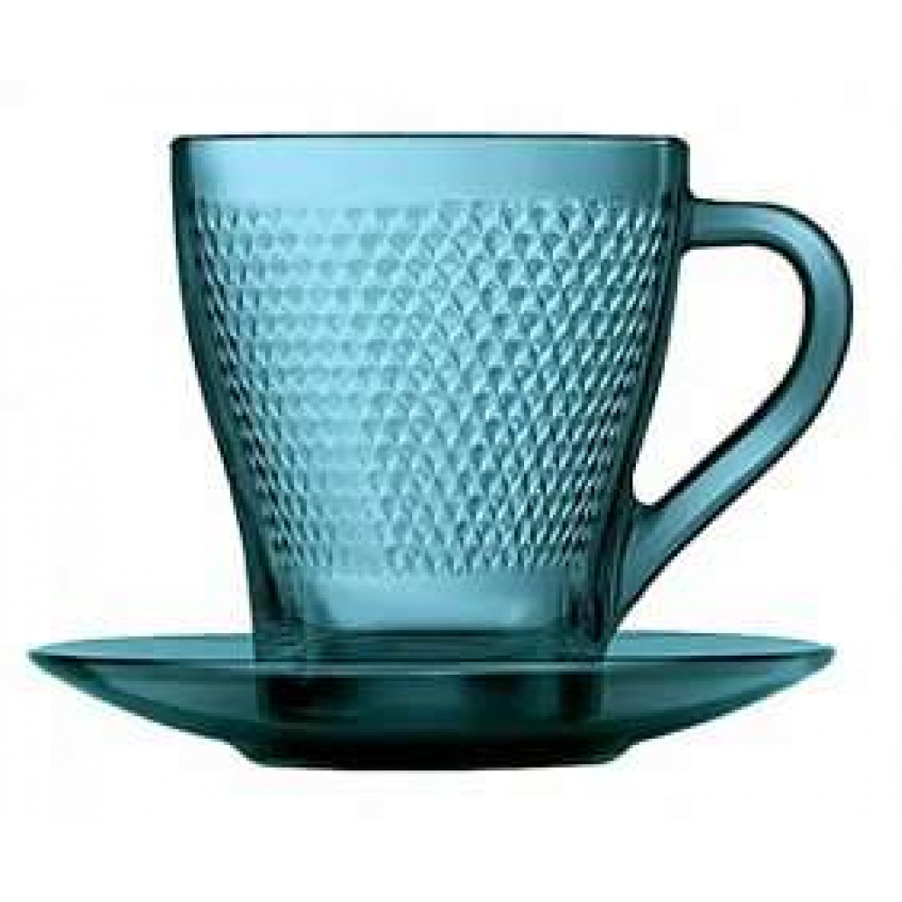 Прозрачное стекло темно-синей окраски, мелкий симпатичный рельеф на высоких стенках и элегантная форма кружки эффектно дополняются стеклянным блюдцем с широкими бортами.