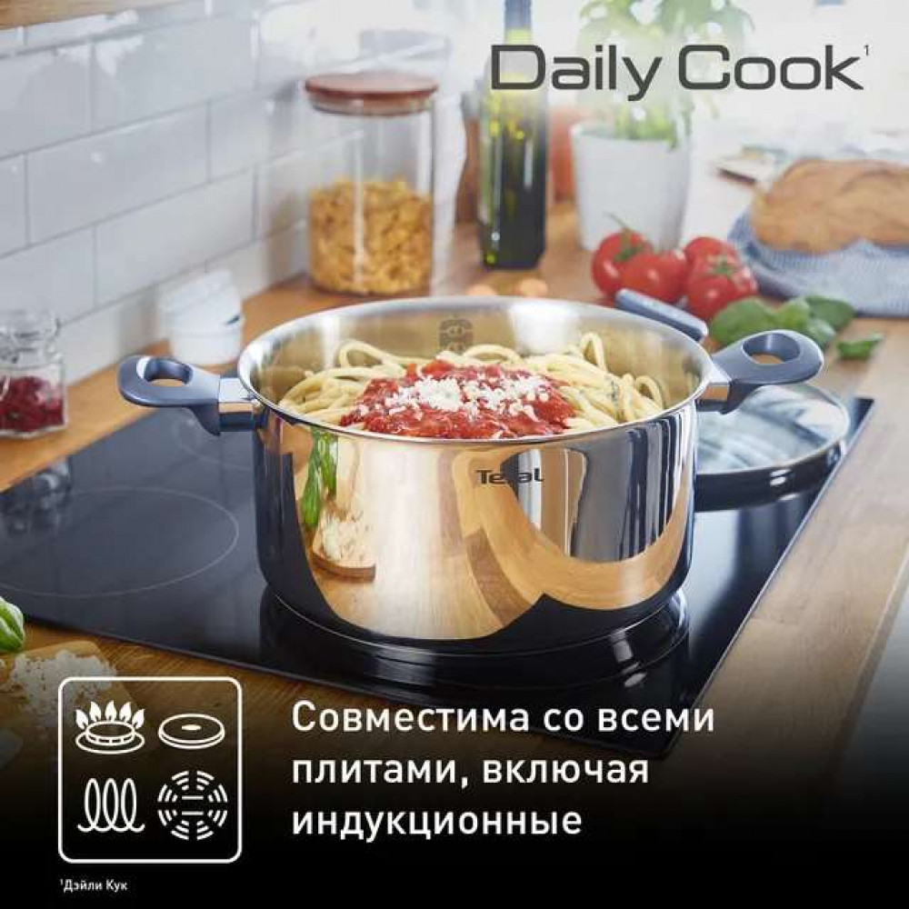 Откройте идеальную комбинацию комфорта и безопасности, простоты и эргономичности с посудой Tefal Daily Cook. Сковороды и кастрюли выполнены из нержавеющей стали премиального качества с прочным дном, изготовленным по технологии HIBB (High Impact Bonded Base). Через стеклянную крышку удобно наблюдать за процессом приготовления, ее можно расположить как на столе, так и на ручке кастрюли — поверхность стола останется чистой. Эргономичные ручки обеспечат удобное и безопасное использование посуды, внутренняя мерная шкала поможет точно отмерить необходимое количество жидкости. Большой объем посуды позволит приготовить обед на всю семью или компанию друзей. Ощутите комфорт ежедневного приготовления вместе с Daily Cook!
