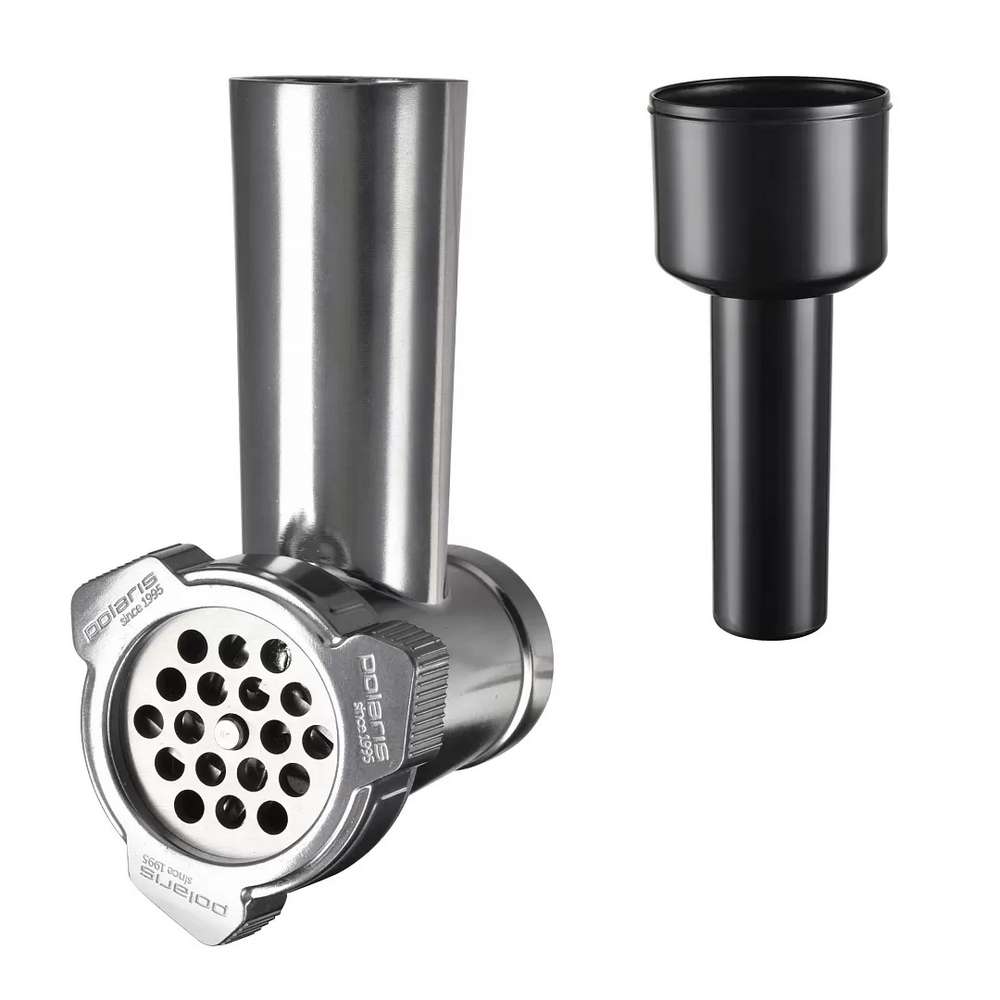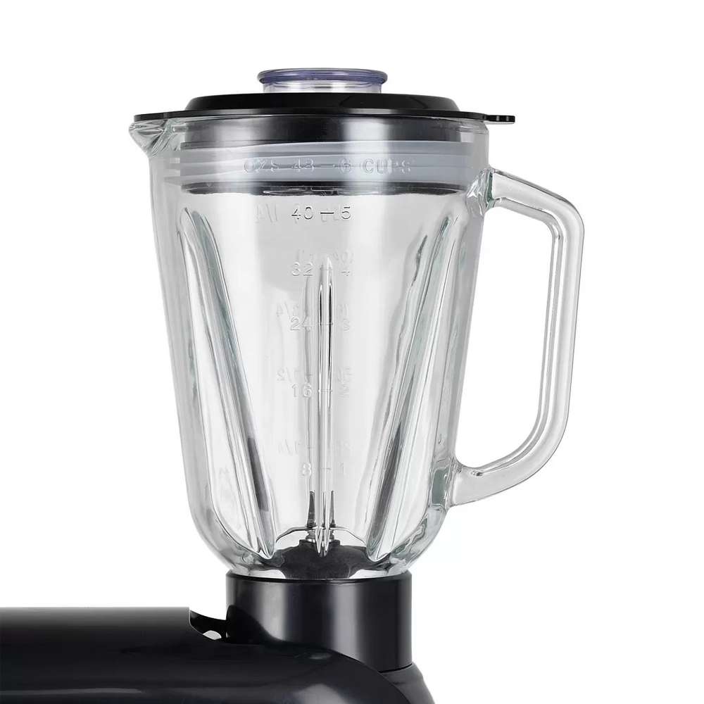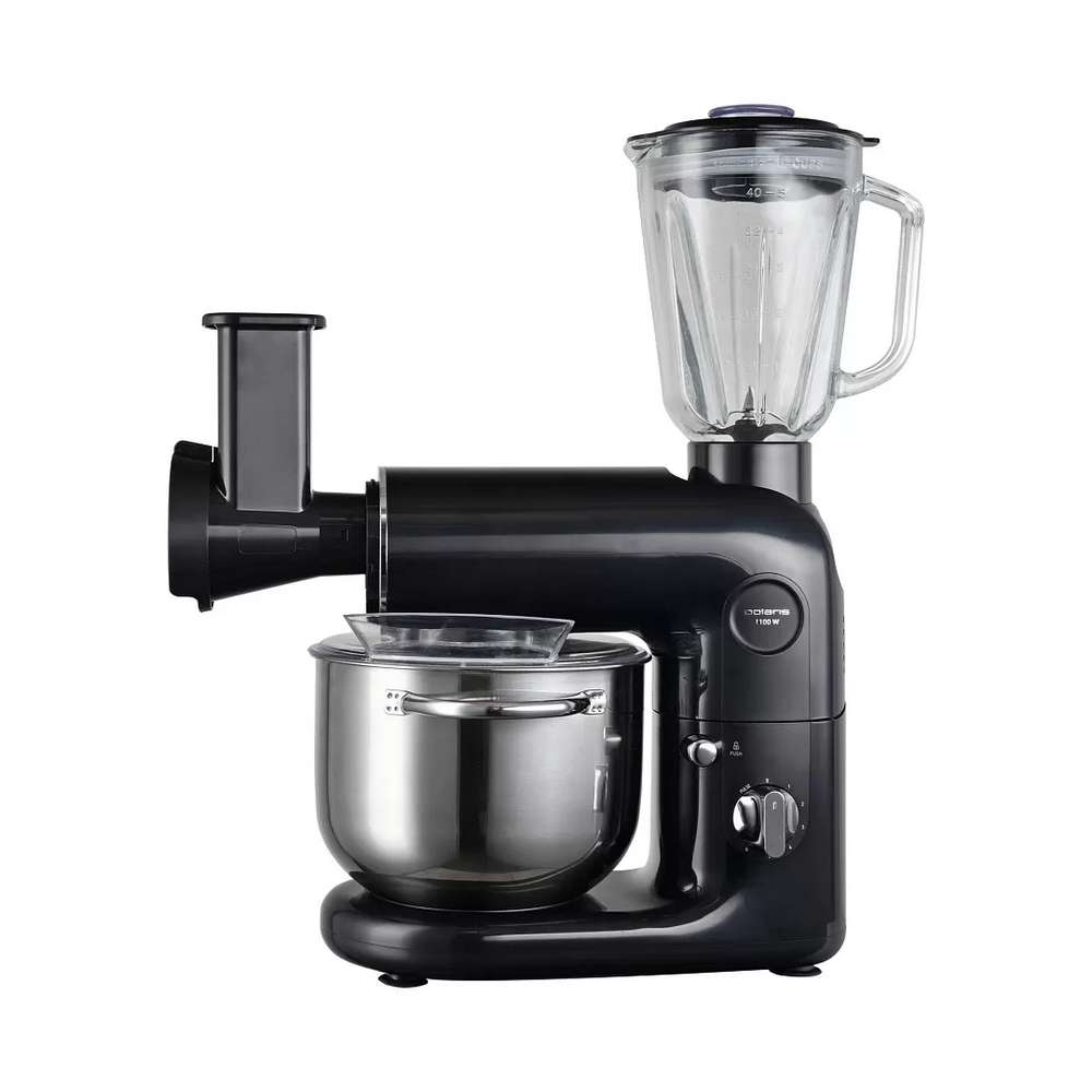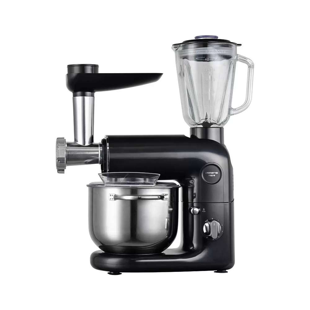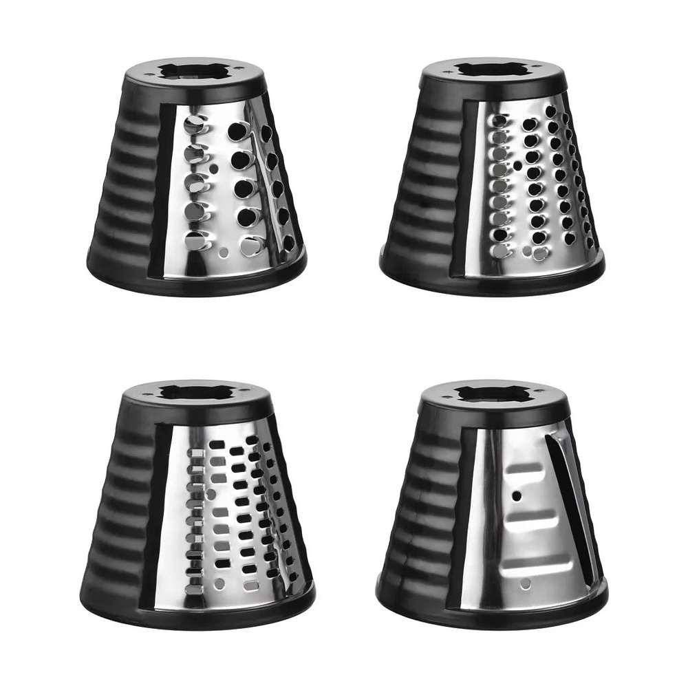 Количество насадок: венчик для взбивания, крюк для замешивания теста, насадка для смешивания, мясорубка с 3 дисками из нержавеющей стали (3, 5 и 7 мм), насадка для кеббе насадка для колбас блендер (1,5 л) овощерезка 4 барабана (крупная терка, мелкая терка, терка для шинкования, терка для драников)