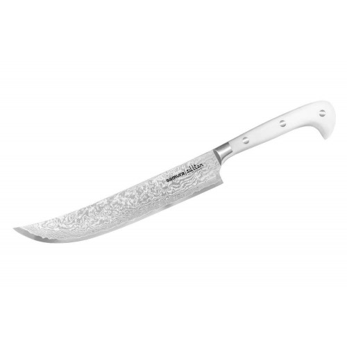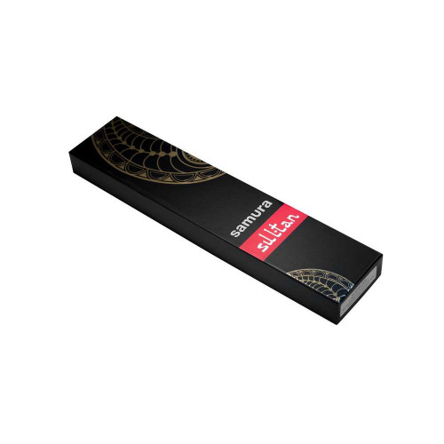 У ножа Samura SULTAN для нарезки, 210 мм – очень удобная и эргономичная рукоять, которая повторяет изгибы ладони. Пальцы обхватывают рукоять Пчака и упираются кончиками в ладонь. Такой кухонный нож весьма удобен при нарезке овощей и мяса - кисть меньше устает, да и сам хват становится крепче. При случайном резком движении, широкая пята в основании клинка, заменяющая упор, не дает соскользнуть пальцам под режущую кромку ножа.