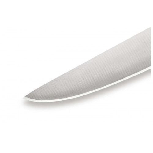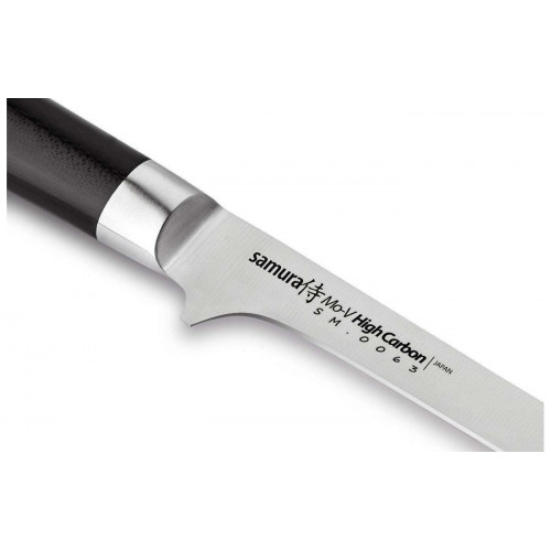 Нож для обвалки из популярной у покупателей коллекции Samura Mo-V изготовлен из высококачественных материалов и отличается демократичной ценой. Лезвие из японской стали AUS-8, известной своей коррозиестойкостью и долгим сроком службы. Режущая кромка заточена на водных камнях под минимальным углом и закалена до твердости 58 HRC – долгое время сохраняет остроту и не требует правок и заточек. Тонкое длинное лезвие оптимально подходит для выверенной нарезки и разделки мяса. У основания имеется выступ – предохранитель, защищающий пальцы от порезов при неловком движении.
