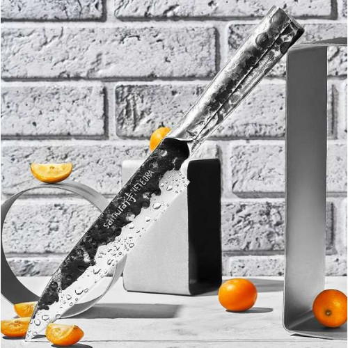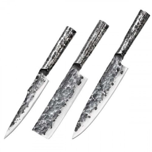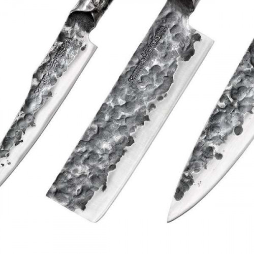 Samura Meteora — красивый набор из 3 кухонных ножей с уникальной прочной кованой отделкой. Весь клинок выкован из цельного куска стали AUS-10 (углеродистая). Этот тип стали известен своей твердостью 60HRC и поэтому может быть очень остро заточен, а также очень долго сохраняет остроту.