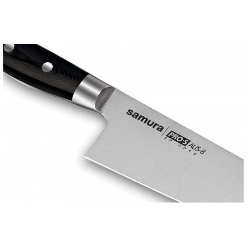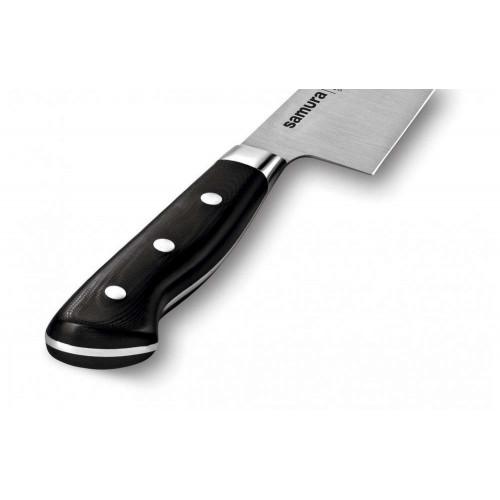 Стальные заклёпки надёжно соединяют клинок Samura Pro-S с рукояткой из технологичного стеклопластика G-10. Классический силуэт сантоку радует взгляд, а несомненная эргономичность и отличная балансировка не дают ни малейшего шанса усталости от долгой работы.