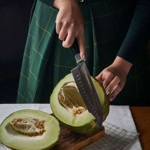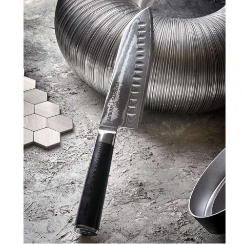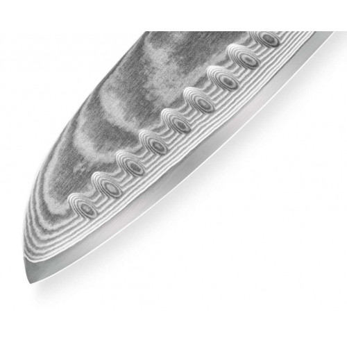 Кухонный нож сантоку из серии Damascus выполнен из премиум материалов, пользуется высоким спросом среди профессиональных поваров. Клинок изготовлен из многослойной японской стали по старинной дамасской технологии с применением современных технологий металлургии: основу из высокоуглеродистой стали обкладывают слоями пакетной стали с различными добавками. Лезвие заточено на водных камнях зернистостью 5000 грит под углом 16-18 градусов. В результате получается очень острое и твердое лезвие с высокой коррозиестойкостью и длительным сроком службы без необходимости частых заточек. Многослойность ножа подтверждает и наличие уникального узора на лезвии, образующегося в ходе производства.