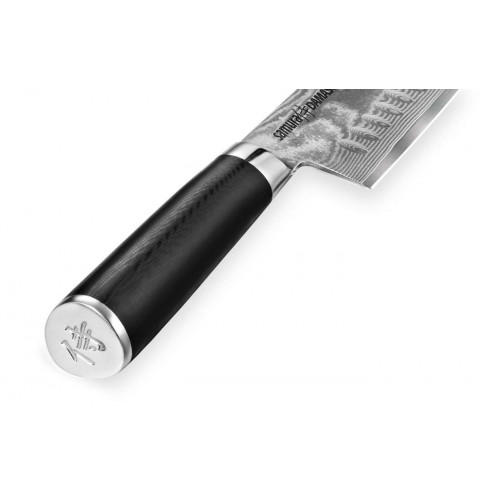 Рукоять ножа Самура не уступает лезвию в качестве исполнения, выполнена из технологичного композита – стеклотекстолита G-10 черного цвета. Хвостовик лезвия проходит через всю рукоять и закреплен с торца. Конструкция не расшатывается со временем, а используемый способ монтажа считается самым надежным и долговечным. Ручка приятная на ощупь, не скользит даже во влажной ладони, а благодаря овальному сечению – не натирает кожу даже при интенсивных нагрузках.
