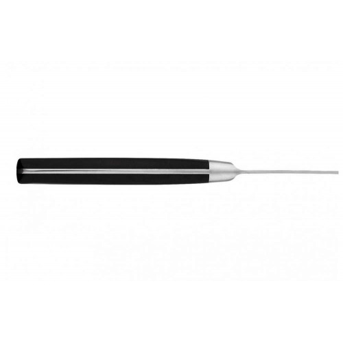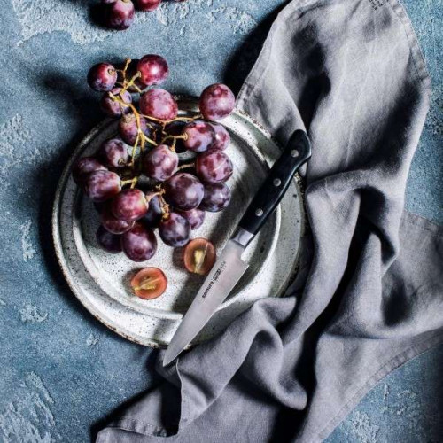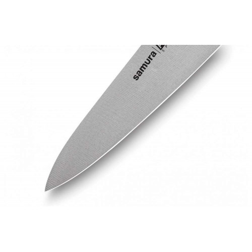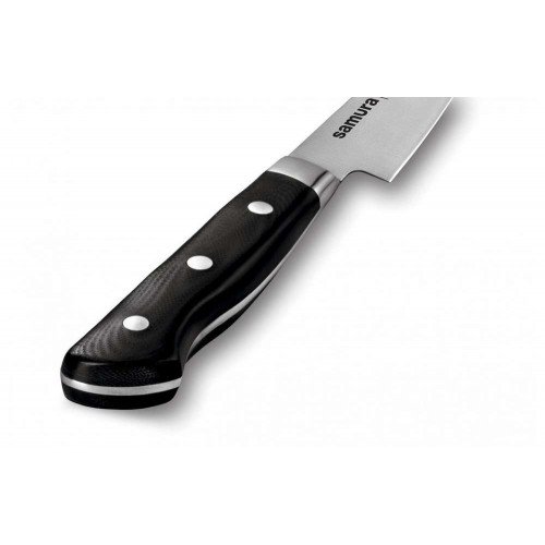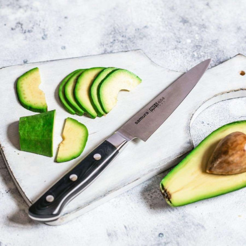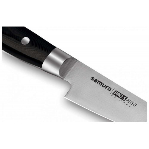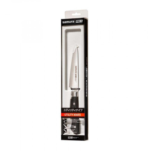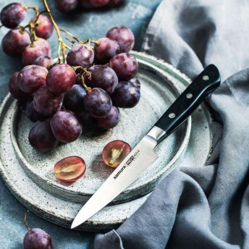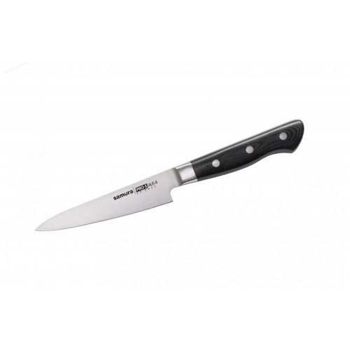 Нож Samura Pro-S универсальный, 115 мм прекрасно выглядит благодаря зеркальной поверхности клинка в сочетании с черной рукоятью. Ее болты не натирают руку, а сама она имеет анатомичную форму. Небольшие габариты сочетаются с отличным балансом, таким ножом удобно работать, и опасаться за него не приходится — клинок выдержит любые испытания.