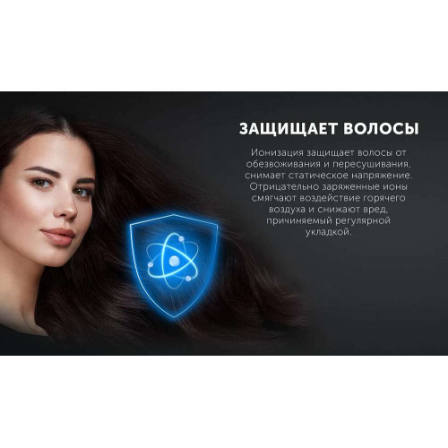 Отрицательно заряженные ионы смягчают воздействие горячего воздуха и снижают вред, причиняемый регулярной укладкой.