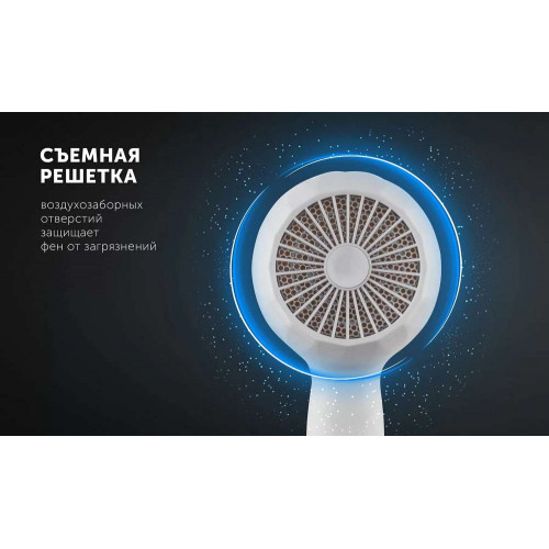 Съемная решетка воздухозаборных отверстий защищает фен от загрязнений при своевременной очистке.