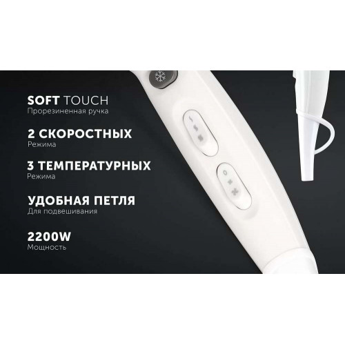 Мощный эргономичный фен с прорезиненной ручкой Soft Touch.