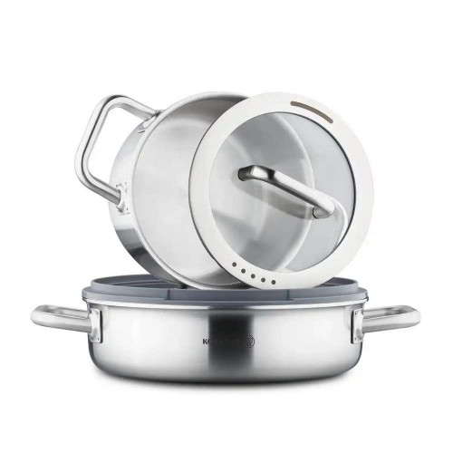 Сталь, самый полезный материал, используемый на кухне на протяжении многих лет, сочетается с дизайном в серии кастрюль Aura.