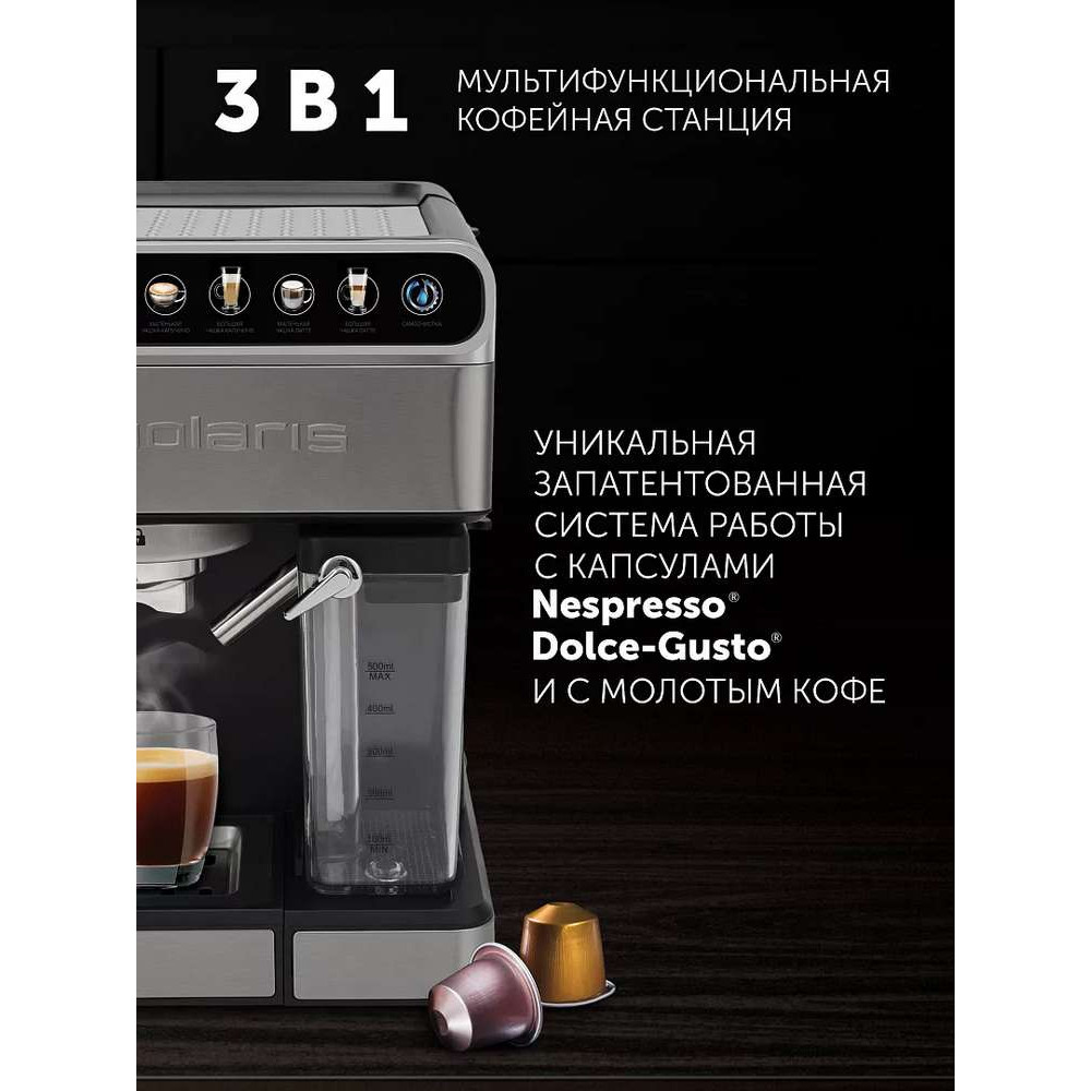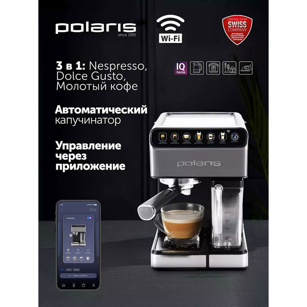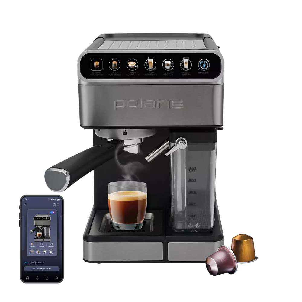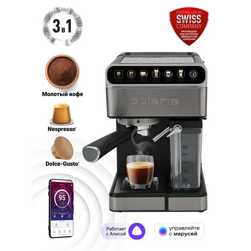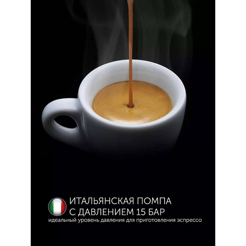 Рожковая кофеварка с автоматическим капучинатором, позволяющим готовить молочно-кофейные напитки в одно касание. Модель 3-в-1: работает с капсулами Nespresso и Dolce-Gusto, а также с молотым кофе. Оснащена шестью предустановленными программами и функцией самоочистки. Помпа итальянского производства с давлением 15 бар обеспечивает насыщенный вкус эспрессо и превосходную кофейную пенку. Сенсорное управление повышает удобство пользования прибором. Современный дизайн с элементами из нержавеющей стали позволяет использовать кофеварку в любом интерьере. А Wi-Fi управление позволит управлять кофеваркой дистанционно.