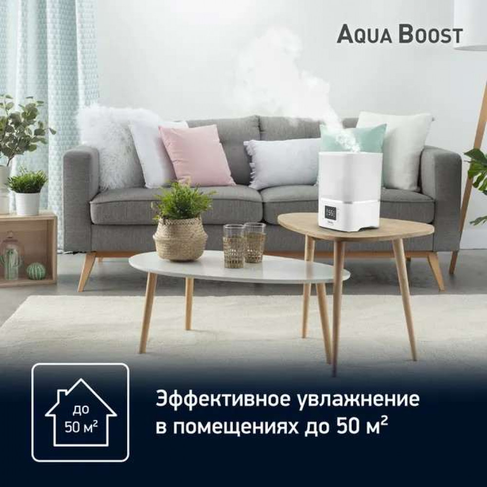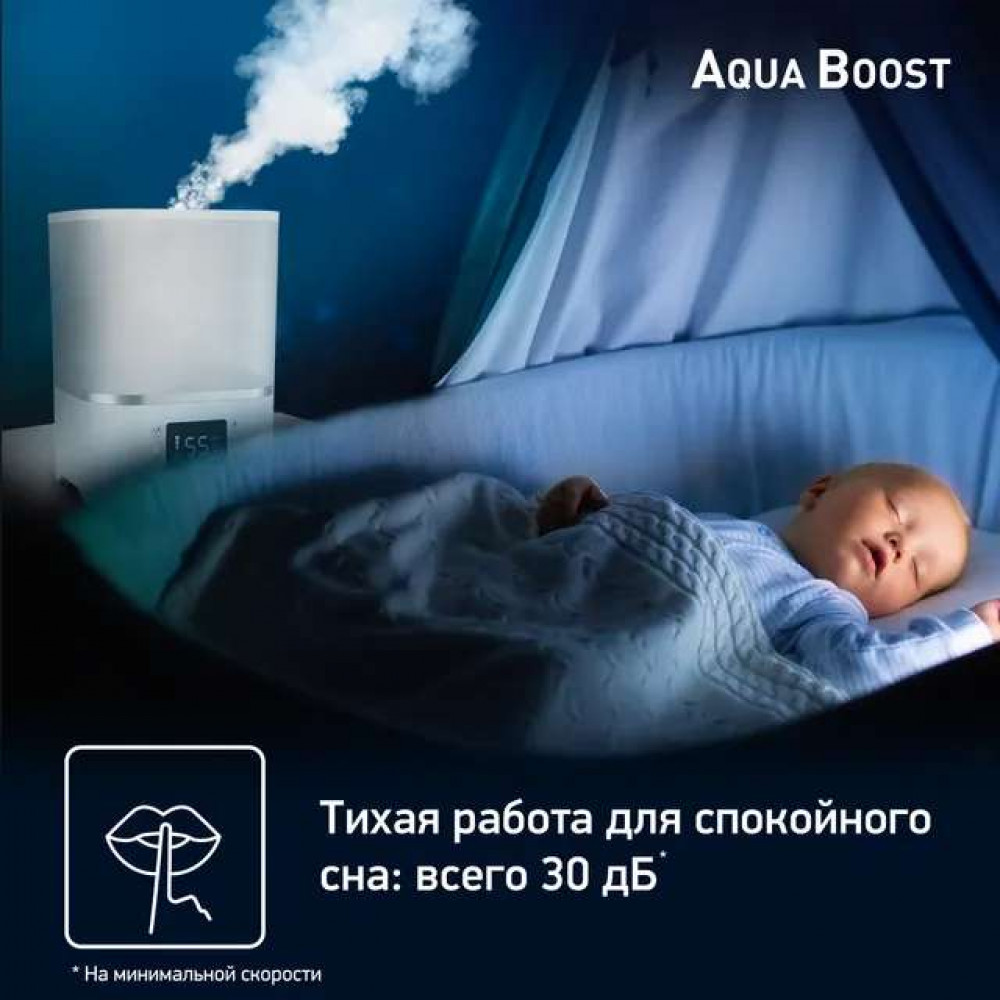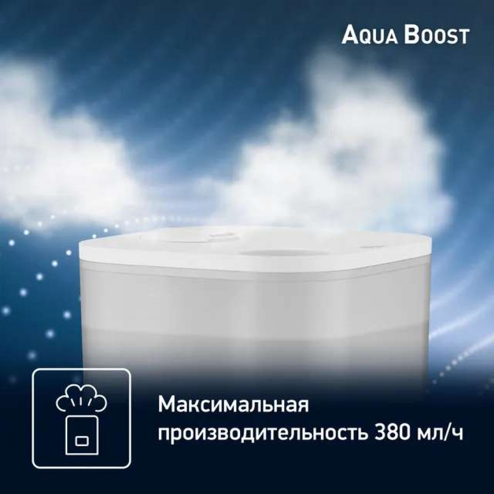 Мощный и эффективный: Прибор испаряет воду со скоростью 380 мл/ч и подает увлажненный воздух на 360° вокруг себя, гарантируя быстрое и эффективное увлажнение помещения площадью до 40 кв.м.