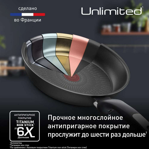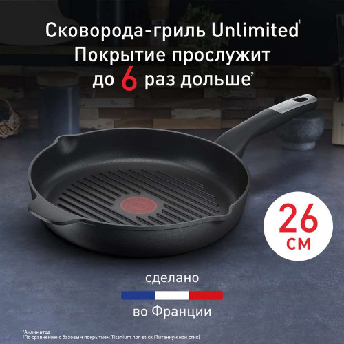Сковорода Tefal Unlimited 26 см E2294074 — это сковорода-гриль с идеальным диаметром для жарки и запеканок. Диаметр 26 см идеально подходит для готовки овощей, мяса и рыбы. Глубокая форма позволяет использовать сковороду не только для жарки, но и для тушения. Сковорода выполнена из алюминия, что обеспечивает равномерный нагрев. Покрытие Titanium 6X обладает антипригарными свойствами и высокой износостойкостью, что гарантирует долговечность и лёгкость в уходе. Индикатор температуры Thermo-Signal подскажет вам, когда сковорода готова для использования, обеспечивая идеальные результаты. Совместима с газовыми, электрическими и индукционными плитами, а её удобная ручка из бакелита гарантирует комфорт и безопасность. Произведена во Франции, эта сковорода сочетает в себе стиль и надёжность. Сковорода Tefal Unlimited 26 см E2294074 — сковорода, которая обеспечит вам удобство и долговечность на кухне.