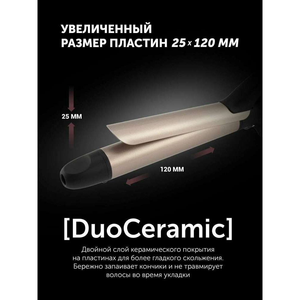 Технология покрытия пластин DuoCeramic защищает и сохраняет здоровый вид волос, обеспечивает легкое скольжение за счет керамического покрытия с двумя дополнительными слоями.