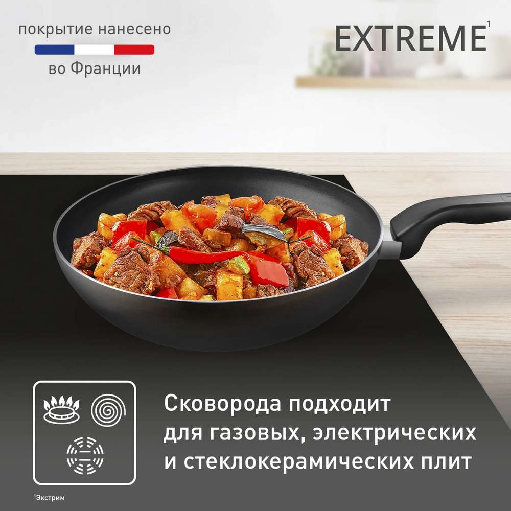 Сковорода Tefal Extreme 28 см 4230628 идеально подходит для жарки и тушения в азиатском стиле. Диаметр 28 см и глубокая форма позволяет готовить большие порции на несколько человек. Корпус сковороды выполнен из алюминия, что способствует равномерному прогреву. Внутреннее покрытие Titanium 2X с антипригарными свойствами делает процесс готовки комфортным и лёгким. Индикатор температуры Thermo-Signal помогает точно определить момент, когда сковорода готова к использованию. Сковорода совместима с газовыми, электрическими и стеклокерамическими плитами. Серия Extreme сочетает в себе стиль, удобство и долговечность для ваших кулинарных потребностей.